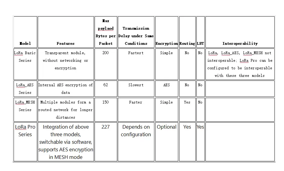 La série LoRa Pro améliorée est compatible avec toutes les versions précédentes des modules de transmission de données LoRa de notre société. Les utilisateurs peuvent configurer le module selon le mode de fonctionnement requis en fonction des besoins de leur application à l'aide d'un logiciel PC. Voici une comparaison simple entre plusieurs versions :