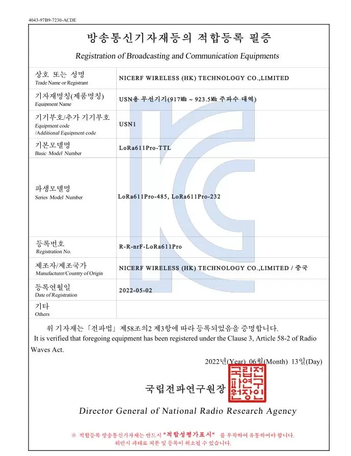 Cet aperçu et comparaison de la série LoRa Pro et des différents modèles de modules de transmission de données LoRa de notre société se termine par la mention du module de transmission de données lora611Pro, qui a reçu la certification KC. NiceRF propose également des services de certification et des services personnalisés pour d'autres modules de transmission de données.