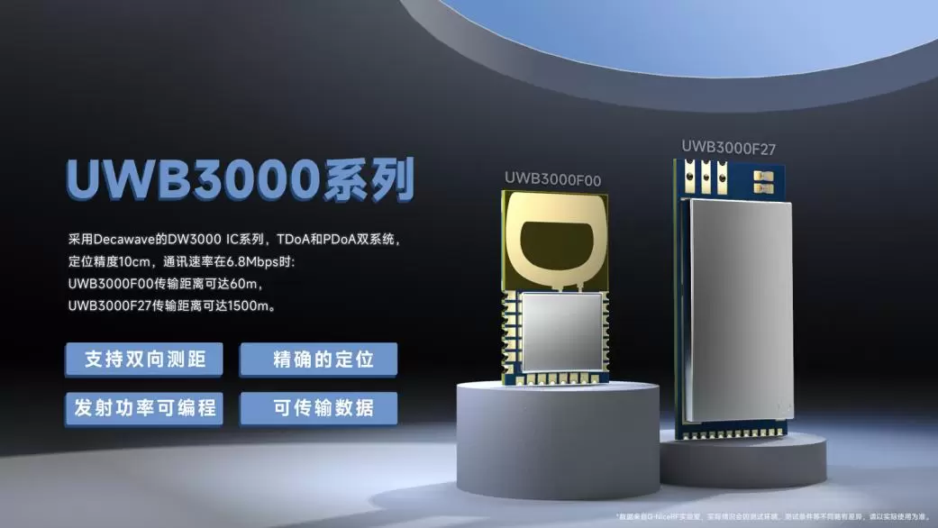 La série UWB3000 comprend deux modèles : UWB3000F00 et UWB3000F2 7 . Il s'agit de modules de positionnement UWB à faible consommation et économiques développés par Sivers Semiconductors utilisant la série de circuits intégrés Decawave DW3000. Ils offrent un débit de transmission de données allant jusqu'à 6,8 Mbps, permettant des systèmes bidirectionnels longue portée, TDoA et PDoA, avec une précision de positionnement de 10 centimètres. Parmi eux, l'UWB300F27 est un module haute puissance de 27 dBm (500 mW) qui intègre un LNA, capable de réaliser une communication, une télémétrie et un positionnement bidirectionnels jusqu'à 1,5 kilomètres (dans des zones ouvertes).