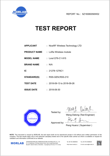 Certification IC : Industrie Canada (IC) est le ministère responsable de la gestion des communications sans fil et du spectre électromagnétique au Canada. La certification IC exige que les modules sans fil soient conformes aux normes de spécifications des normes radioélectriques (RSS) et de compatibilité électromagnétique (CEM) du Canada. Après avoir obtenu la certification IC, les modules sans fil peuvent être légalement vendus et utilisés sur le marché canadien.