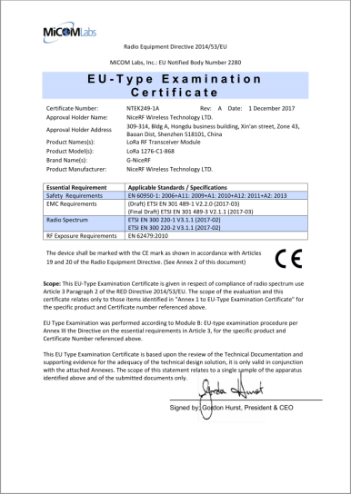 Certification CE : la certification CE est la marque de certification de sécurité des produits de la Communauté européenne, applicable aux produits vendus sur le marché européen. La certification CE exige que les modules sans fil soient conformes aux normes et réglementations techniques européennes, notamment la directive sur la compatibilité électromagnétique (CEM) et la directive sur les équipements radio et les équipements terminaux de télécommunications (R&TTE). Après avoir obtenu la certification CE, les modules sans fil peuvent être légalement vendus et utilisés sur le marché européen.