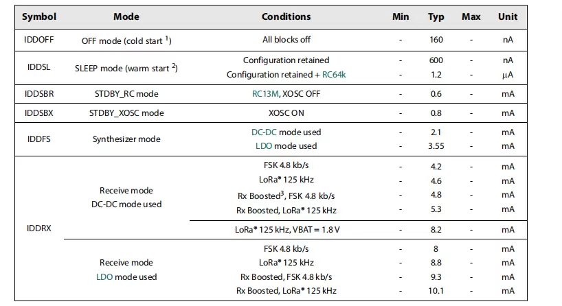 En mode DC-DC, la consommation de courant minimale pendant la modulation FSK avec une transmission de données de 4,8 kb/s est de 4,2 mA. Pour la modulation LoRa avec une bande passante du signal de 125 kHz et une tension de 1,8 V, le courant de réception est de 8,2 mA. En mode Boosted, il existe une légère variation de courant pour la modulation LoRa et FSK.