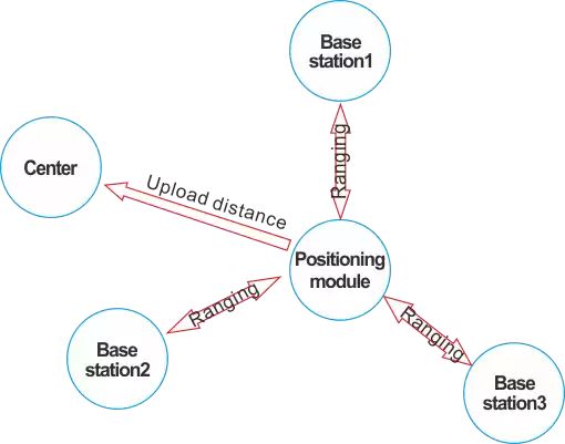 ◆ Le module de positionnement est installé sur les biens à localiser, le centre mesure les distances entre les trois stations de base séparément (état de télémétrie) et télécharge ces trois distances au centre (état de communication).
