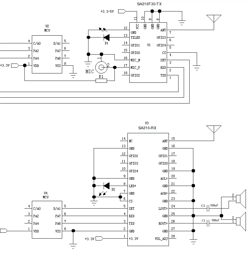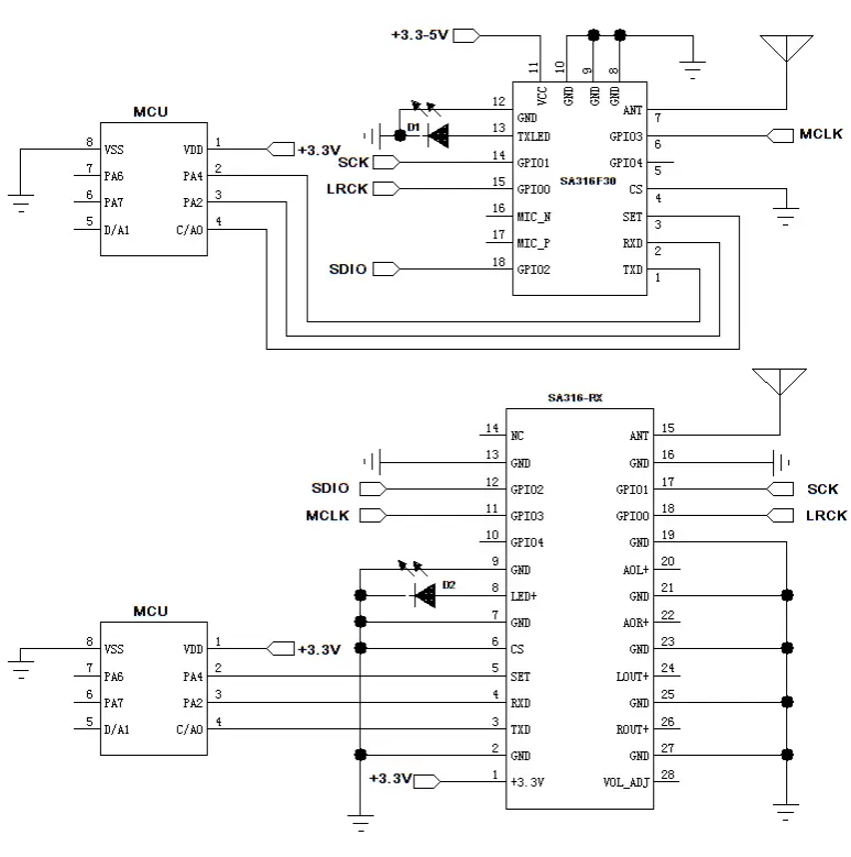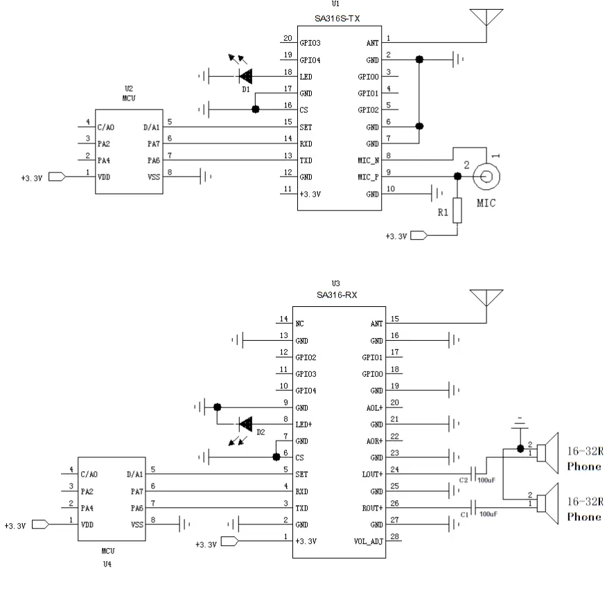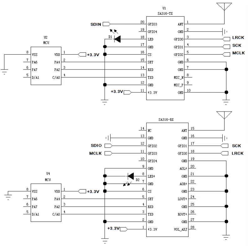 La série SA316S se compose des modules émetteurs SA316S-TX et SA316F30, ainsi que du module récepteur SA316S-RX. Cette série intègre une puce de transmission vocale sans fil de haute qualité. Elle prend en charge les interfaces audio numériques bimodes PCM/IIS externes et offre aux utilisateurs une interface série standardisée. Les utilisateurs peuvent régler rapidement et facilement la fréquence de l'émetteur-récepteur, le volume, le gain du microphone et d'autres paramètres du module via des commandes de port série, ce qui est largement utilisé dans les situations nécessitant une qualité sonore élevée.